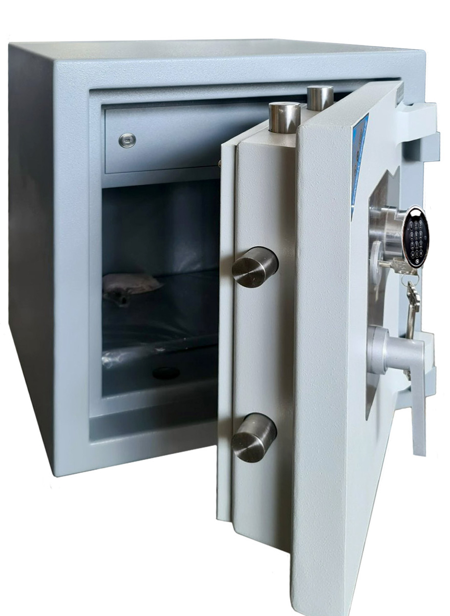 • Khóa Điện Tử thông minh: Hệ thống khoá điện tử vận hành khoá mở mã bằng thuỷ lực, có thể cài đặt 06 mã số trở lên, mã tuỳ thích rất linh hoạt, có khả năng chống dò mã số nên cực kì an toàn, bền vững theo thời gian.